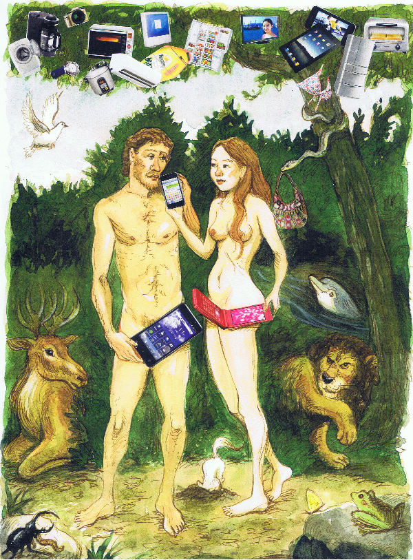 You illustration portrays the First Couple as remaining in the Garden of Eden because they can approach the infinity of immortality with all their gadgetry. But what happens when they get bored? Wouldn’t they need some kind of button to push to give them something that is not on their control? The only thing I can think of that satisfies that is Nature. Nature is a jack-in-the-box. It transports us from our usual thoughts and experiences and let’s us not be in control. Doesn’t being bored usually make one seek more and more technology which is again to be controlled? It’s like achieving higher and higher levels in a video game. At some point one wants to be surprised and overwhelmed and out of control.