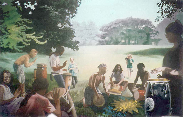 Usually, the people here who participate in this don’t like photographers, but I explained that I was only taking shots to make a painting, so they let me do it. I used my photos as reference for this oil painting. It’s about 40″ x 30.” That’s my wife on the right, playing the conga.