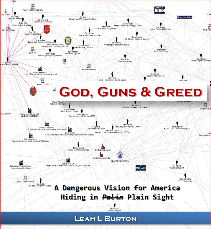 Drawing from years of research and a personal familiarity with the Alaskan politics that spawned the Star of Dominionism – Sarah Palin – Ms. Burton offers accessible insight not just to C Street but to the breadth and depth of the New Apostolic Reformation as it seeks power, high and low, throughout America. Quoting from participants, she lets their words show the passion and commitment Dominionists have to taking over America– and the world.