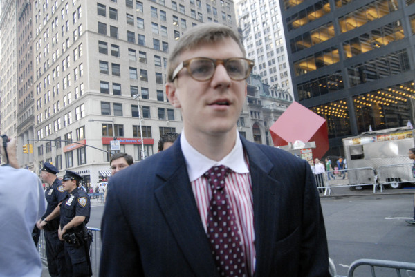 In case you don’t recognise him, this is James O’Keefe – Mr Acorn-Pimp-Bug-Mary-Landrieu’s-Office-Breitbart-Boy, himself. Ne’mind the fact that he seems to have violated his probation in attending the demonstration. One thing for certain: where O’Keefe is, you can be sure he’s there at the bidding of Andrew Breitbart, and he’s there at this demonstration, really, for one reason only: ratfuckery.